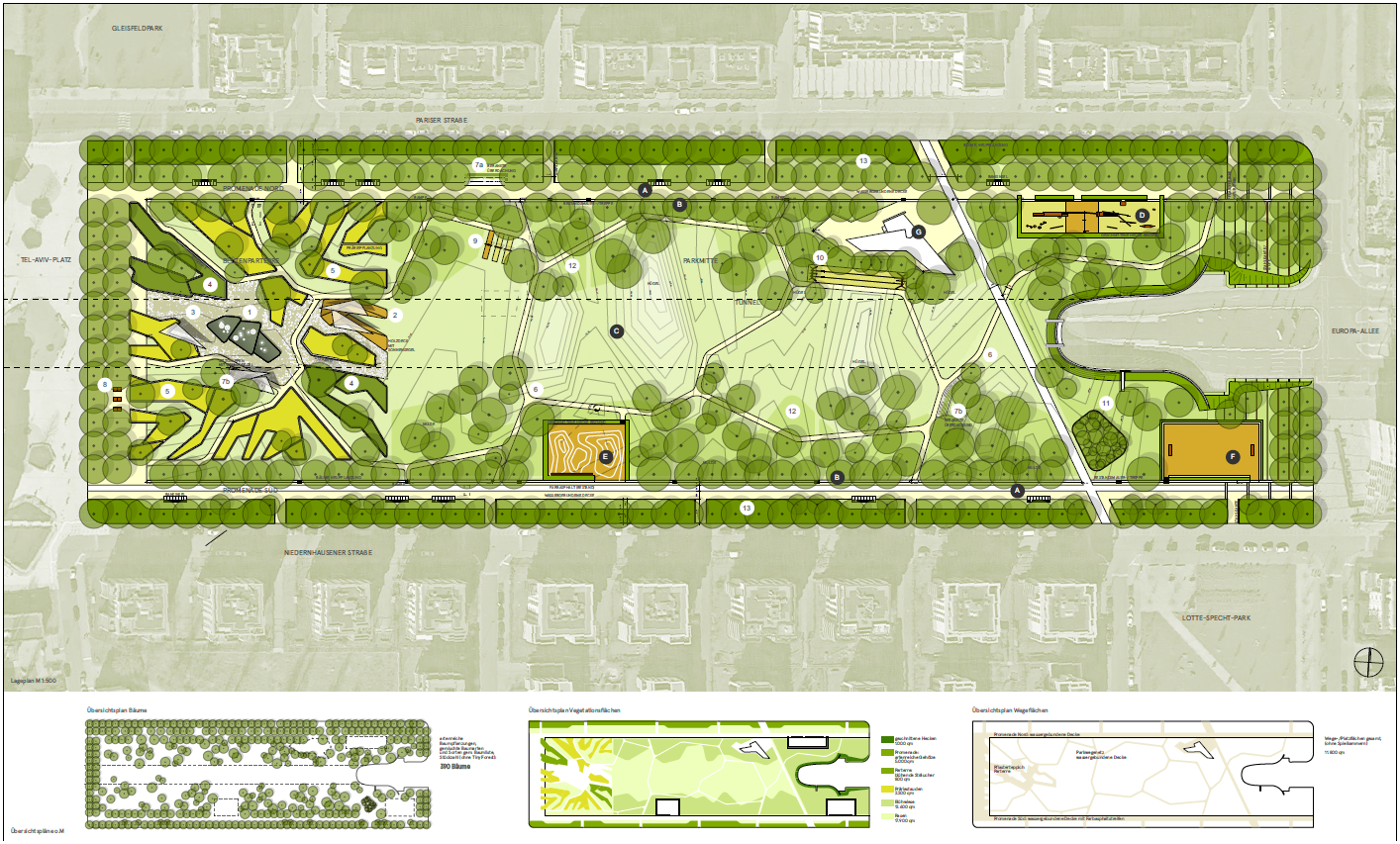 In mehreren Bauabschnitten wird die Gestaltung des Parks weiterentwickelt: in den Promenaden und der zentralen Parkmitte entstehen schattige Aufenthaltsorte, unter anderem durch neue Baumstandorte in den Wiesenflächen, Pergolen und zusätzliche Sitzgelegenheiten. Versiegelte Wegeflächen werden deutlich reduziert, Grünflächen vergrößert, Rasen zu Wiesenflächen umgewandelt und durch neue Nutzungsangebote ergänzt. Geplant sind außerdem ein Trinkbrunnen, eine neu gestaltete Wasserspielfläche mit Fontänen sowie Spiel- und Freizeitangebote wie Boule- und Tischtennisflächen.